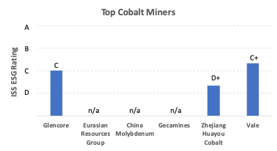 Some of the companies are private, and therefore without ESG grades (Figure 7). Vale, which has the lowest cobalt production of the group (being predominantly an iron ore producer), has the highest ESG rating, at C+.